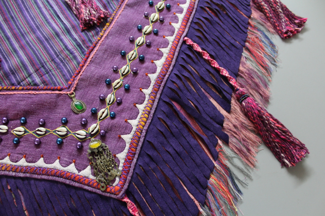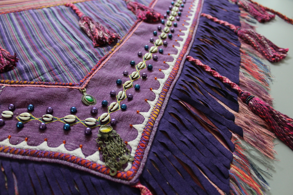 Aufwendig handgearbeitetes Upcycling Tribal Hüfttuch mit Macramee Quasten, Schmuckanhängern, Kaurimuscheln, Filzbandapplikation, Perlen, Stickerei und Fransen