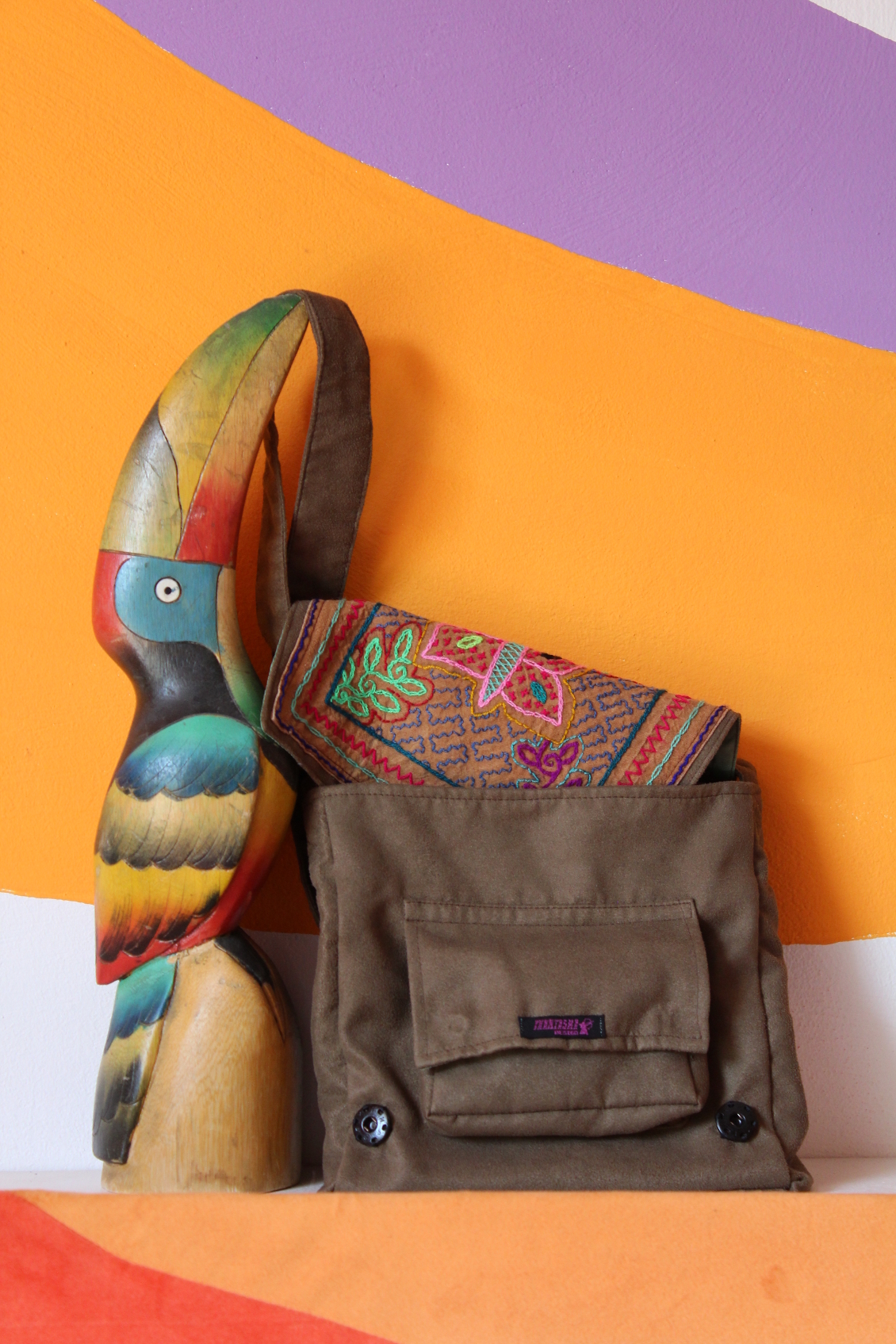 Diese bezaubernde Umhängetasche aus leichtem braunem Wildlederimitat besticht durch einen bunten originalen handgestickten Patch der Shipibo Conibo aus Peru in der Front. Solltest du dich also entschließen dir diese Tasche zu eigen zu machen, unterstützt du somit die Indigenen vor Ort. Einige Nähte des Patches leuchten unter Schwarzlicht, zum Beispiel der Schmetterling, die grünen Blätter, sowie die Umrandung.