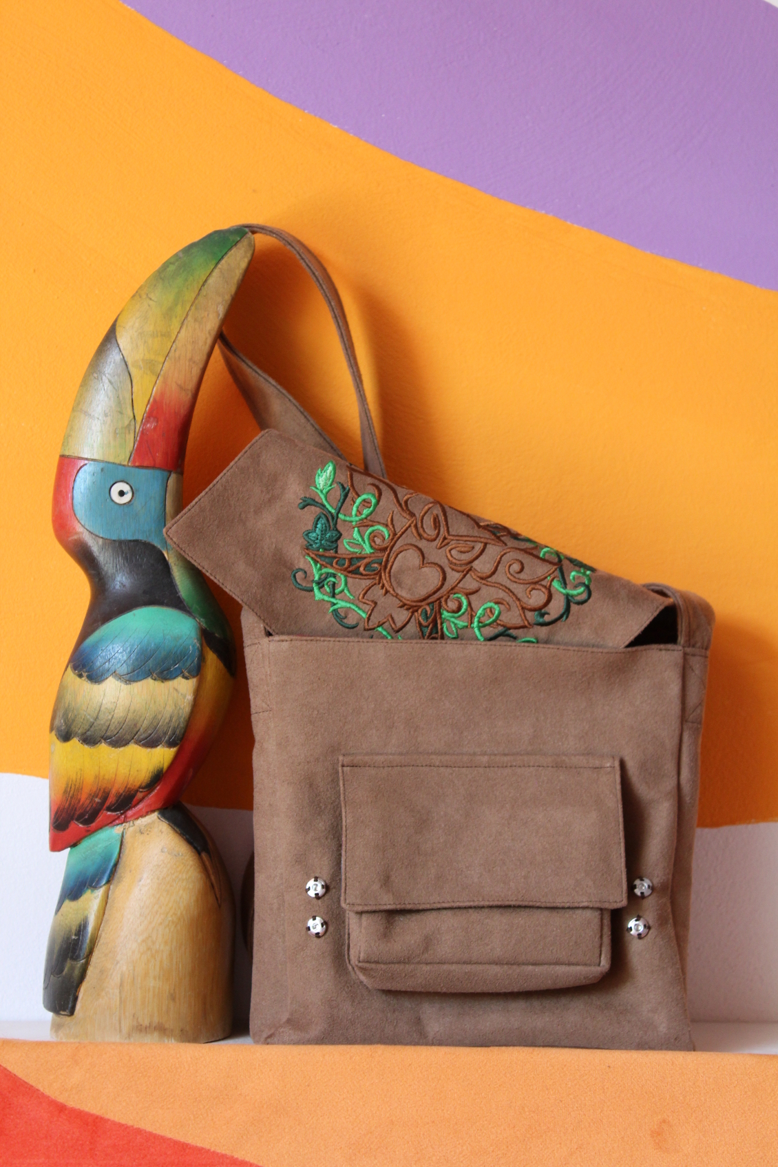Eine Tasche für diejenigen, die es farblich erdig und waldig mögen. Die schimmernde Stickerei der Eule ist, umspielt von Ranken und Efeu, verspielt und verschnörkelt. Das Außenmaterial der Umhängetasche ist aus formstabilem braunem Wildlederimitat. Öffnet man die Deckklappe der Tasche mithilfe der vier kleinen angenähten Druckknöpfe, so kommt das Futter der Tasche zum Vorschein, welches ein Backsteinmuster aufweist. So kannst du bei neugierigen Blicken und Fragen nach dem Inhalt oder dem Gewichts deiner Tasche immer wahrheitsgemäß antworten, dass sich Backsteine in deiner Umhängetasche verbergen. Die vier Druckknöpfe der Deckklappe ermöglichen dir einen besseren Halt, sofern du alle verschließt. Solltest du mal etwas mehr im Gepäck haben, kannst du auch lediglich zwei Druckknöpfen nutzen um etwas mehr Spielraum in der Höhe zu erhalten.