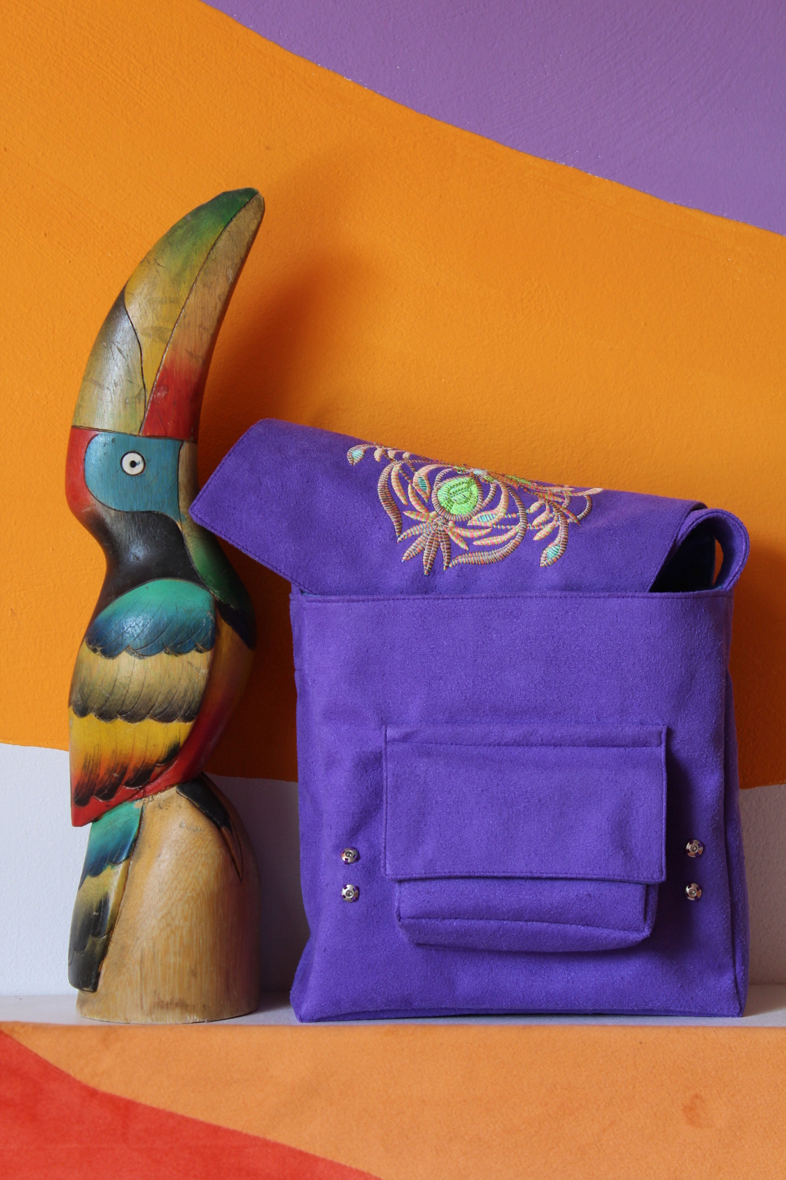 Formstabiles lila Wildlederimitat, verziert mit einem Ornament, das es in sich hat. Bei näherer Betrachtung der Stickerei fällt auf, dass hier mit Multicolor Stickgarn gearbeitet wurde. Dieses führt zu einem Ringeleffekt innerhalb der Stickerei. Als wenn diese Besonderheit nicht schon genug Anreiz wäre sich diese Tasche zu schnappen, ist es sicherlich noch erwähnenswert, dass die Stickerei brilliant unter Schwarzlicht leuchtet. So findet man dich auf dem Dancefloor ganz leicht wieder. Öffnet man die Deckklappe der Tasche mithilfe der vier kleinen angenähten Druckknöpfe, so kommt das Futter der Tasche zum Vorschein. Nicht wundern, wenn du Sternchen siehst! Das Futter ist blau mit goldenen Sternen. Die vier Druckknöpfe der Deckklappe ermöglichen dir einen besseren Halt, sofern du alle verschließt. Solltest du mal etwas mehr im Gepäck haben, kannst du auch lediglich zwei Druckknöpfen nutzen um etwas mehr Spielraum in der Höhe zu erhalten.