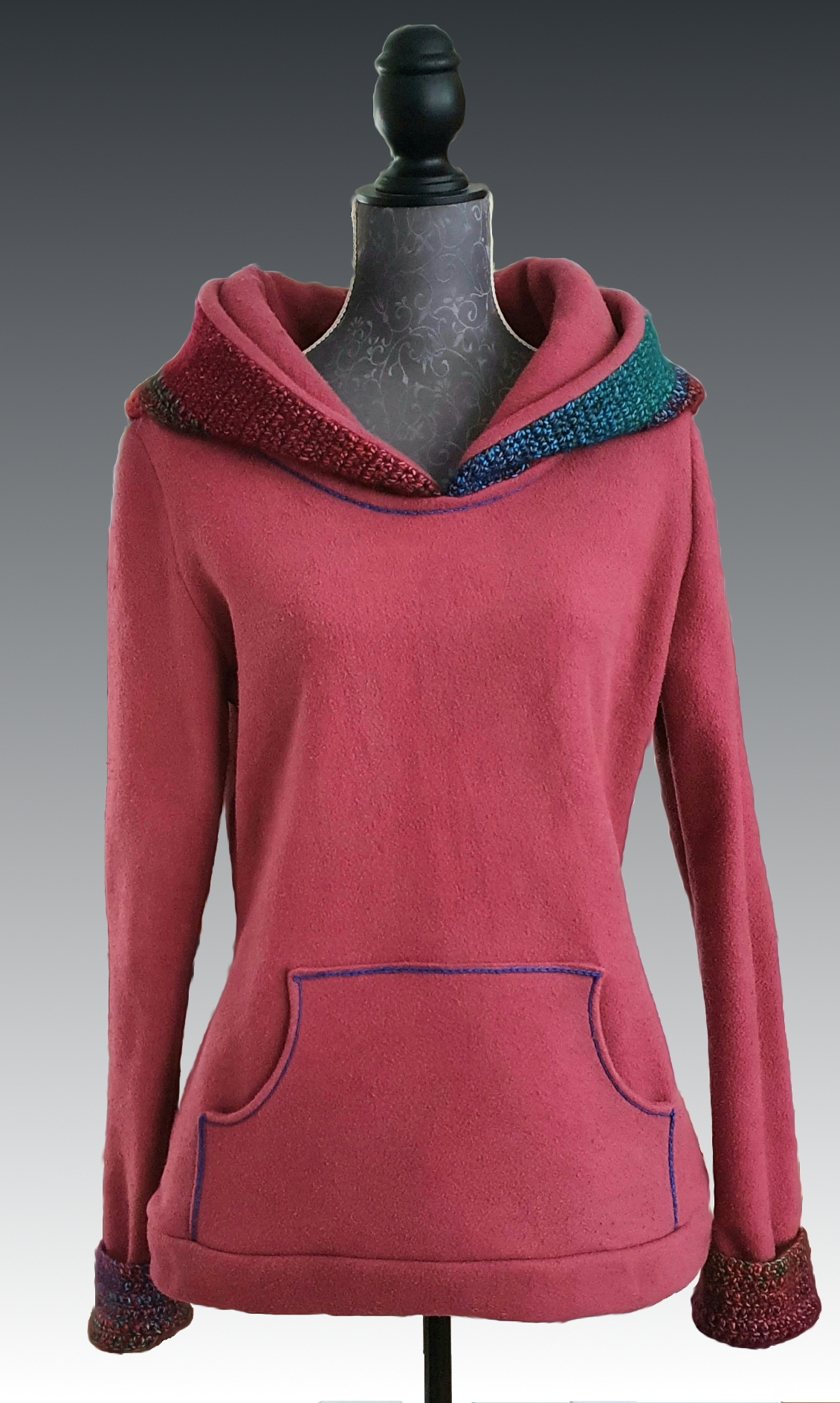 Der Hoodie Robla besticht durch sein Farbspiel aus vielen Rottönen, die mit blauen Akzenten abgerundet werden. Unmöglich in diesem Kapuzenpulli nicht positiv aufzufallen. Während er durch seine Farbgebung schon zu einem warmen Gemüt führt, sorgt der handgefärbte Baumwollfleece in Bioqualität für die nötige Körperwärme an kalten Tagen, aber auch in kalten Festival Nächten. Setzt man obendrein die doppellagige bunte Häkelkapuze auf, kann man seine Körperwärme noch besser speichern. Die blaue Stickerei an Tasche und Halsausschnitt steht im Kontrast zum Rot des Hoodies und fällt besonders schnell ins Auge. Jedoch findet man auch in den gehäkelten klappbaren Armabschlüssen, sowie der Kapuze die kühle blaue Erfrischung bei diesem heißen Hoodie.
