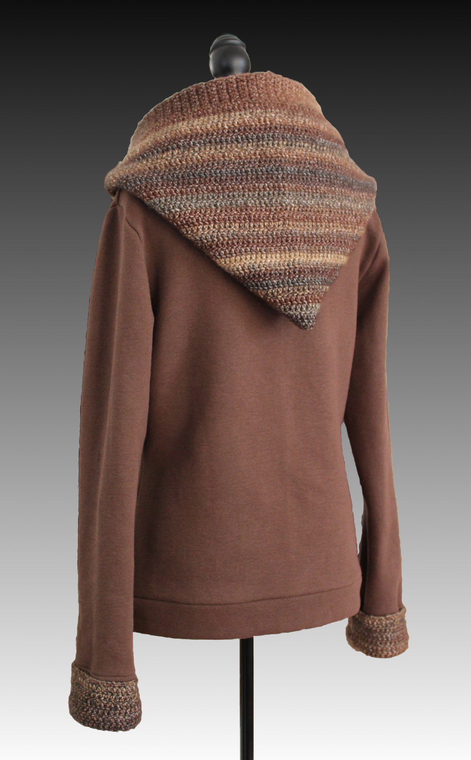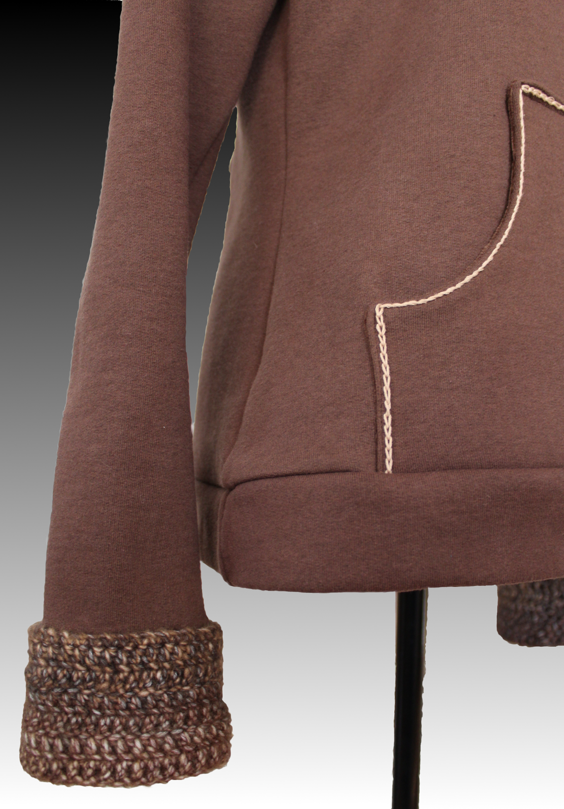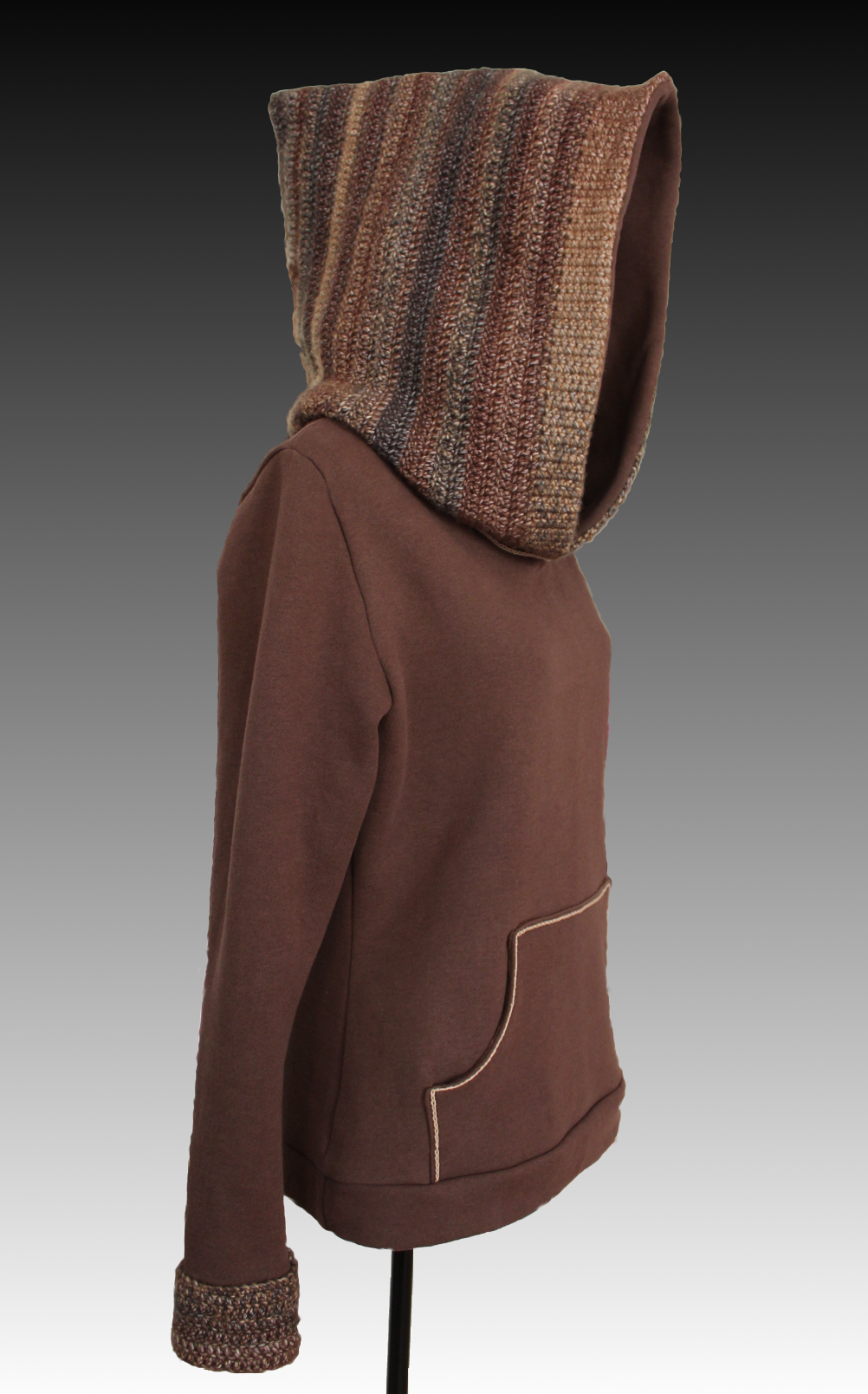 * handgefärbt *Häkelarbeiten an Kapuze und Armabschlüssen * Stickerei an Tasche und Halsausschnitt * doppellagige Verarbeitung von Kapuze und Tasche