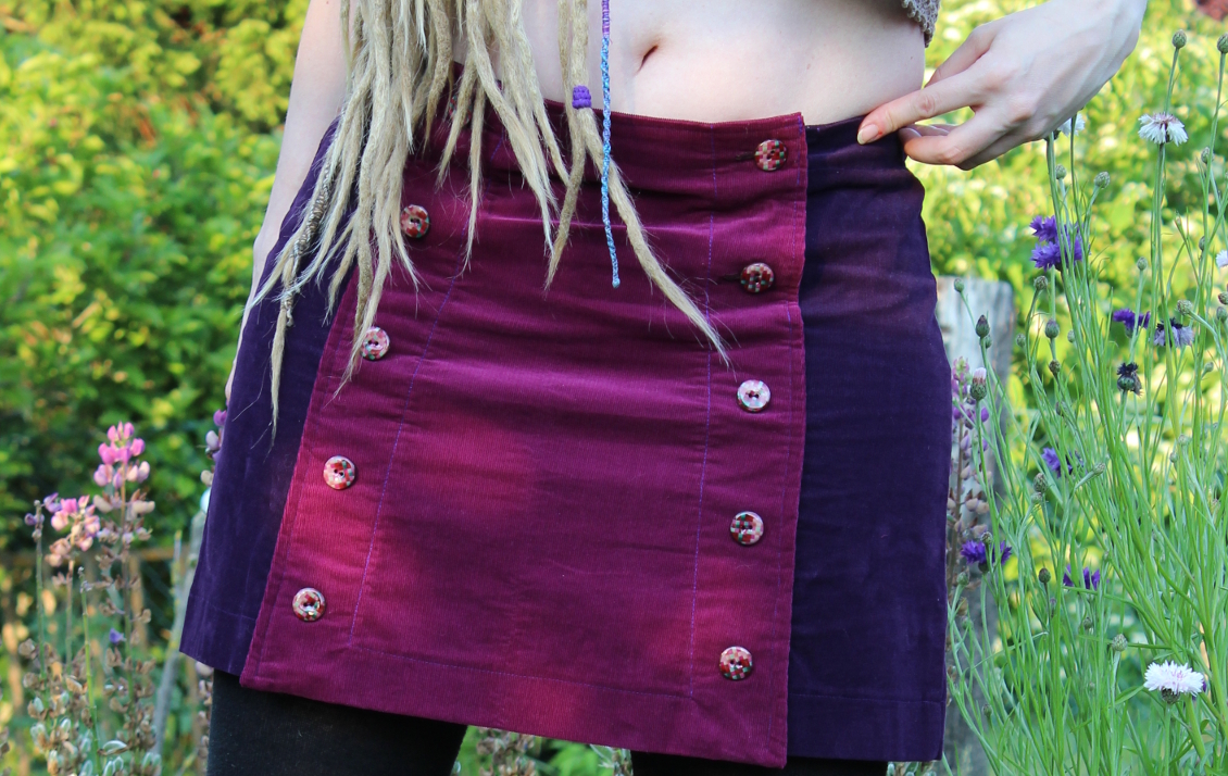 Ein leichter Sommerrock aus dünnem Babycord in Violett und Pink, verziert mit Holzknöpfen mit Mosaik Optik. Die samtige Oberfläche lässt einen wunderschönen Schimmer entstehen. Die pinke Front setzt sich oben und unten etwas in der Länge ab um den Panel Effekt zu verstärken. Die rechte Knopfleiste ist rein imitiert und ohne Funktion. Die linke Knopfleiste lässt sich oben ein Stück öffnen um ein müheloses An- und Ausziehen zu ermöglichen. Für die Festigkeit dieses Verschlusses sind auf der inneliegenden Seite zusätzliche Druckknöpfe eingearbeitet.