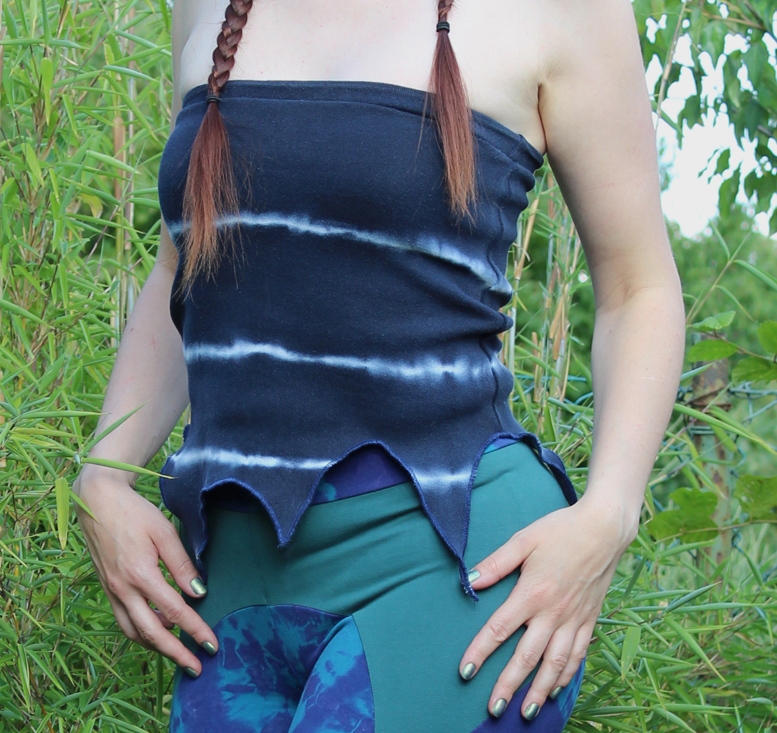 Trägerloses blaues Upcycling Top mit weißen Streifen und zipfeligem Elfensaum. Fester Halt durch eingezogenes Gummiband.